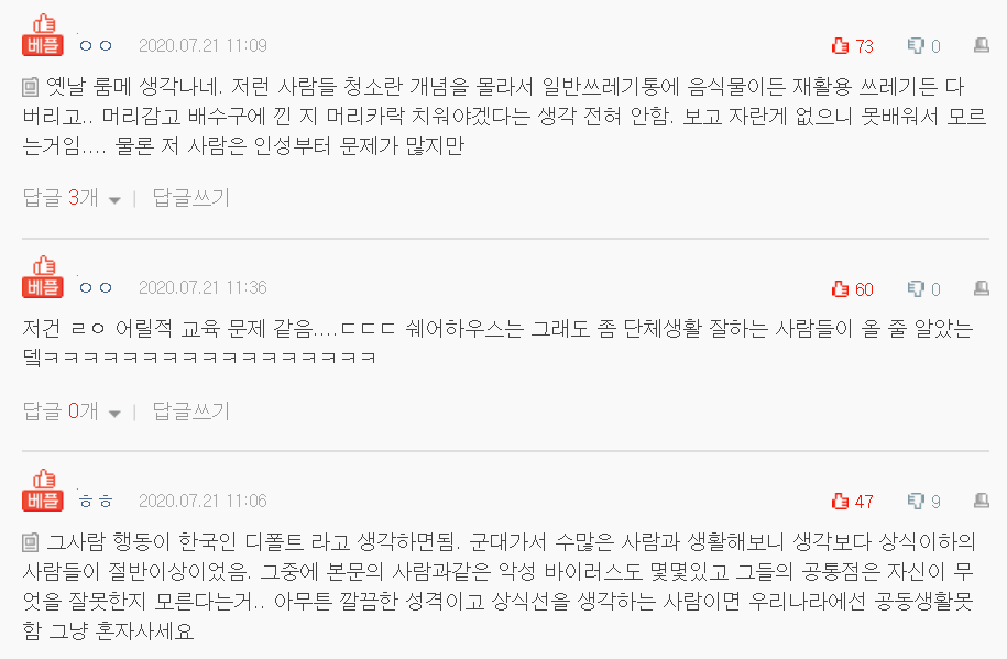 쓰레기 분리수거통 있는데 거기에 음식물 먹은 편의점 도시락 등등을 거기에 안넣어놓고 위에다 그냥 올려둠. 음식물은 당연히 있음.
