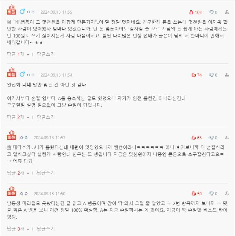 A는 처음엔 진짜로 글을 올렸냐, 진짜 올릴 줄 몰랐다고 하면서 활당해 하다가 댓글을 좀 읽어보더니 이건 생각의 차이인 것 같다고 댓글에 자기 편드는 사람도 있고, 끼리끼리라고 하는 사람도 있다고 완전히 너네 말만 맞는 건 아닌 것 같다고 하는 중이고요.