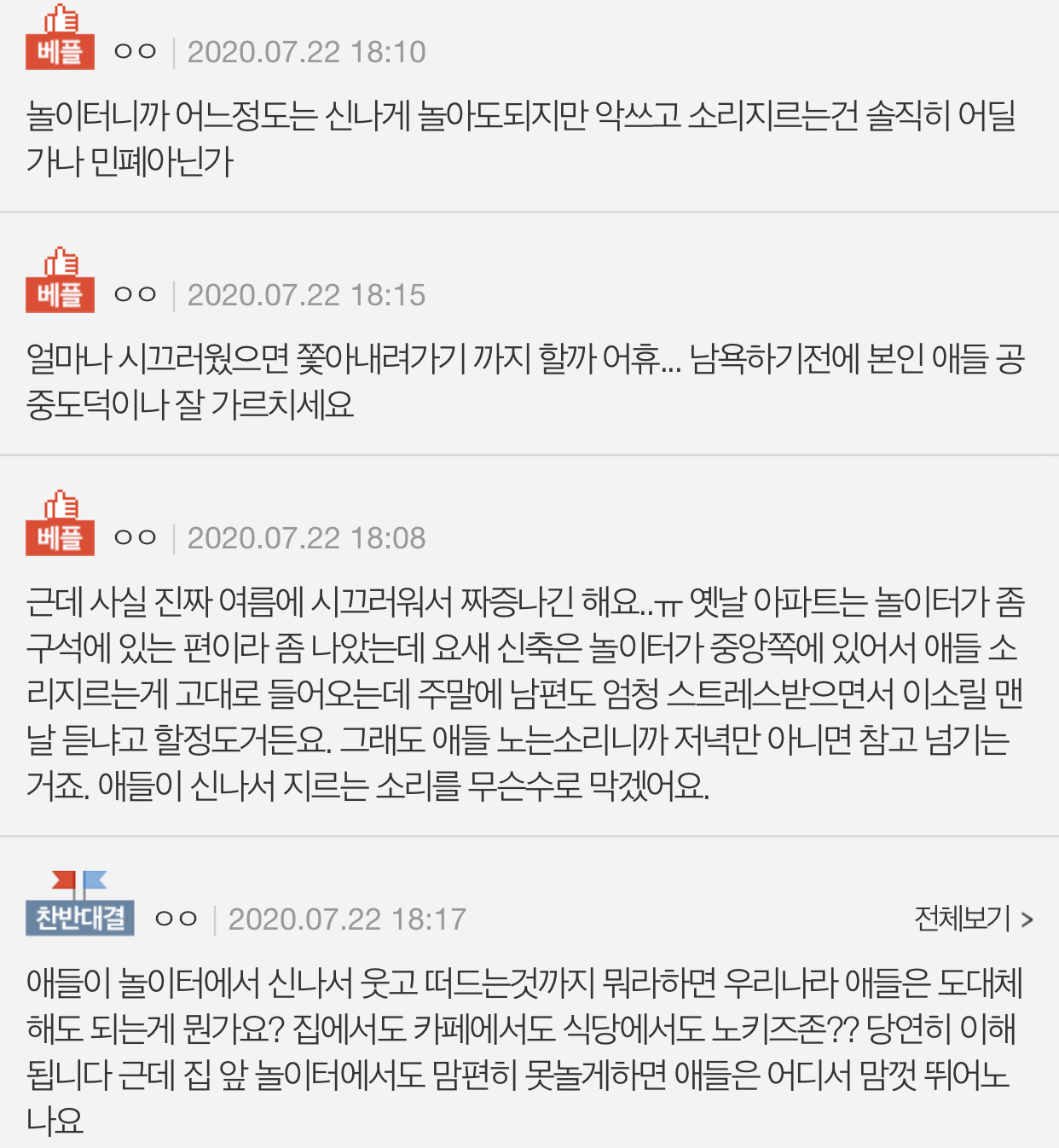 더워죽겠는데 내가 내집에서 시끄러워서 문못여는게 말이 되냐면서 따져 드는데 반대로 내집 놀이터에서 놀지도 못하냐고 따지고 싶었네요..; 그냥 참고