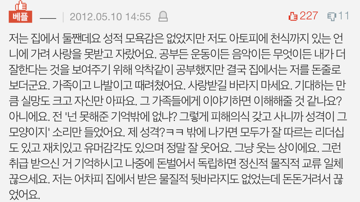 그 사랑과전쟁 내용 중 처럼.. 동생이 제 노트를 찢고 낙서를 하고제 물건을 가져가면 엄마는 그깟게 뭐라고 동생한테 싫은소리를 하냐며무슨잘못을 하면 (가령 집에 늦게 간날), 맞고 숨이 넘어갈듯울고 엄마에게 잘못했다 빌었습니다.