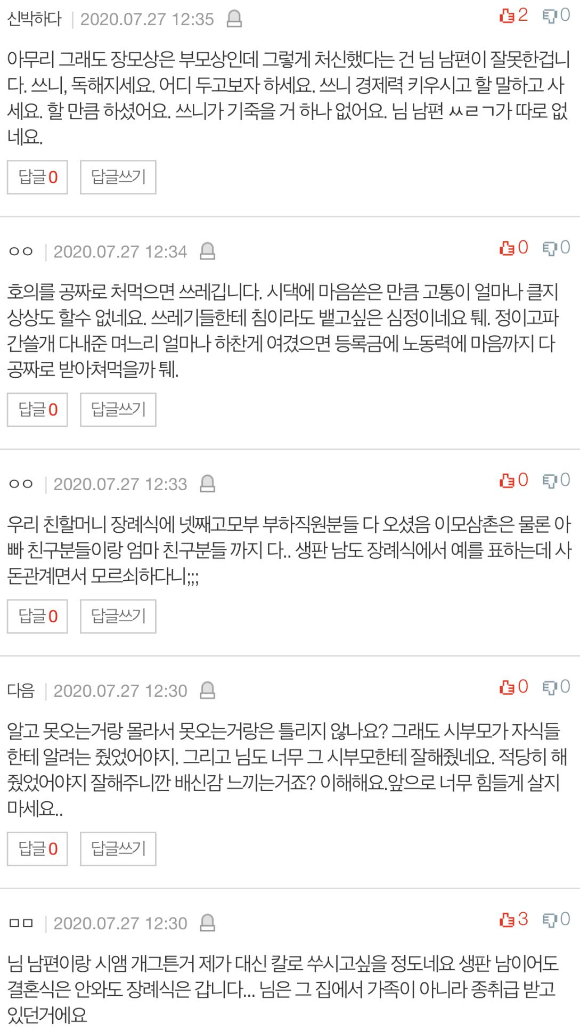 남편한테 악을쓰고 분노로 표현해서 남편도 이런 제모습 처음봤을거에요 장례식장 찝찝하다고 상치르는데 아들은 집에 와서 자라고 하더라고요 남편은 니네 오빠가 둘이나 되는데 그게 뭐 어떻냐고 하더라고요 결국 왔다갔다할때 남편차로 모시고왔다갔다했구요 아주버님이랑 시누이들한테는 오면 힘들까봐 시부모님이