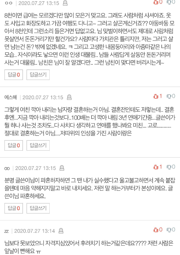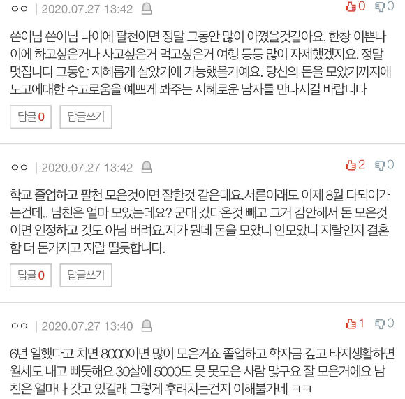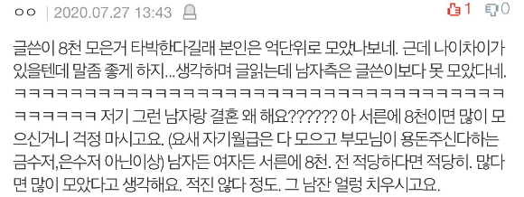 제 친구들 얘기 들어봐도 그렇고 주위 결혼한 사람들 얘기 들어봐도 서른살이 (대4년제 졸업) 팔천 모은거면 정말 알뜰 살뜰 산거라고 하는데 남자친구만 제가 씀씀이가 좀 헤픈 편이고 잘 못모은거란 식으로 얘기를 해서 기분이 상했고 약간의 말다툼이 있었어요