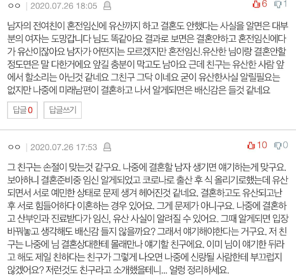이렇게 많이봐주실줄 몰랐어요 댓글 정말정말 감사합니다!! 속상하지만 친구와 관계는 신중히 생각해봐야겠네요...ㅠㅠ 또 글의 요지가 아니라 혼전임신에 대한 자세한 내용은 적지 않았는데 제 생각을 말씀드려볼까해요~ 혼전임신에 대한 부정적인 시선이 왜만들어진건가요? 단지 우리나라 정서와 맞지않는다는 이유라면 더읽으실 필요없을것같아요 ㅎㅎ 결혼의 전제없이 책임지지 못할상황에 만들어진 아이가 걱정되는 마음에서 생겨난거 아닌가요? 제 생각엔 혼전인가 혼후인가 보다는 아이를 키울 사랑과 여건이 되는가가 중요한 요소라 생각해요. 누가 맞다 누군 틀렸다가 아니라 개개인의 생각의 차이인것 같아요. 저희는 아이를 사랑으로 키울 생각이었고 아기가 자랄 좋은환경, 능력, 책임감 가지고 있었어요. 그저 우리나라에선 정서적으로 비개방적이고 환영하는 분위기가 아니라고해서, 다른사람들 시선때문에 제가 제아이 가진걸 부끄러워하고 움츠려들며 말해야하나요? 아기가질 생각이 없는데 피임안한건 조심하지 못한게 맞겠지만 혼전이나 혼후나 저흰 아이갖고 싶었어요. 4년만났고 둘다 나이좀있어요. 양가결혼얘기나오고 식장 알아보자 하는 시기에 아기가 생겼습니다. 코로나때문에 결혼식은 아기낳고 하자했었어요. 어쨋든 헤어졌다하시는데 아기잃는 과정에서 실망스러운부분이 많아 헤어지자했어요 잘모르고 하는 얘기들이지만 책임감없다 꾸역꾸역 낳는다 라는 발언은 보낸 제아기를 모욕하는것처럼 느껴져서 글적습니다 빼액 거리는걸로 보시면 어쩔수 없구요