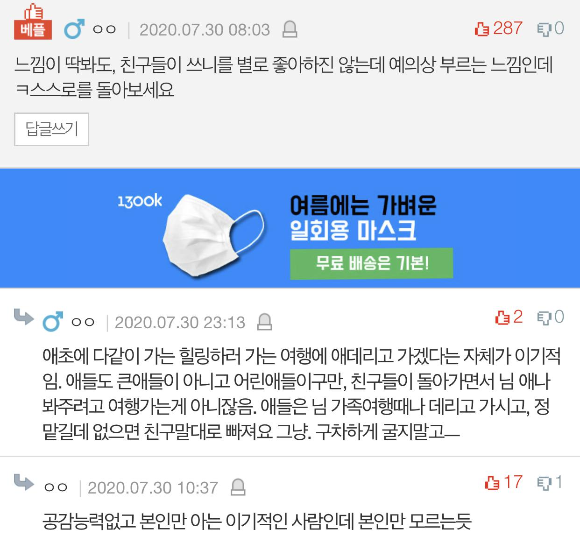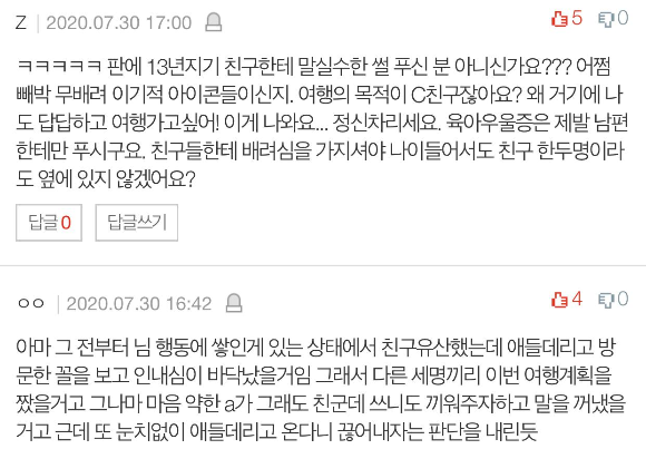 요즘 안 그래도 힘든데 애들 맡기고 놀러 갈 생각하냐고 짜증 내길래