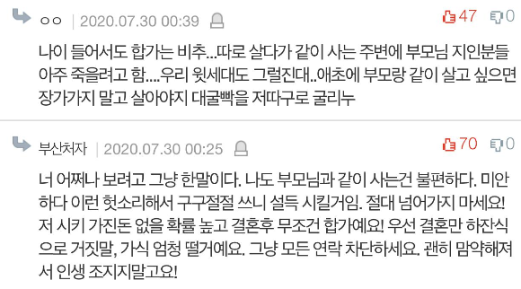 저:나중에 자기네든 우리네든부모님들 연세 많아지셔서 거동 불편하시면어쩔 수 없이 모실 수도 있겠지만 누가 신혼부터 합가를 해?
