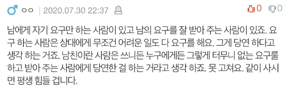 저:연애하면서 그런걸 말할 이유가 뭐가 있어?그럼 자기는 왜 그동안 나한테 결혼하면 부모님 모시고 살 거라고 미리 말 안했는데?남친:돈이 없잖아, 돈이