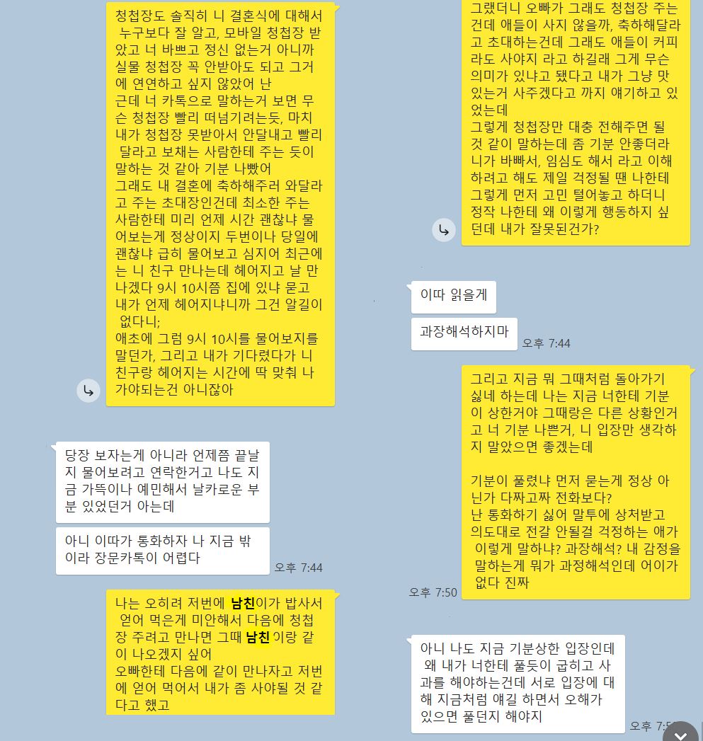제 생각 뿐일 수 있겠지만 청첩장을 주려 만나자할 때의 태도들을 보아 청첩장도 제가 달라고 조르는거마냥 제발 좀 주고싶다, 어떻게던 그냥 넘기고 가려는듯한 태도.