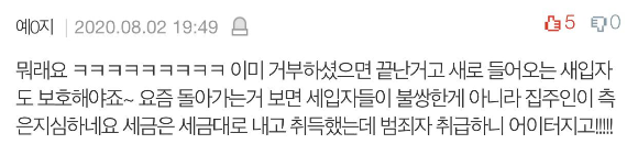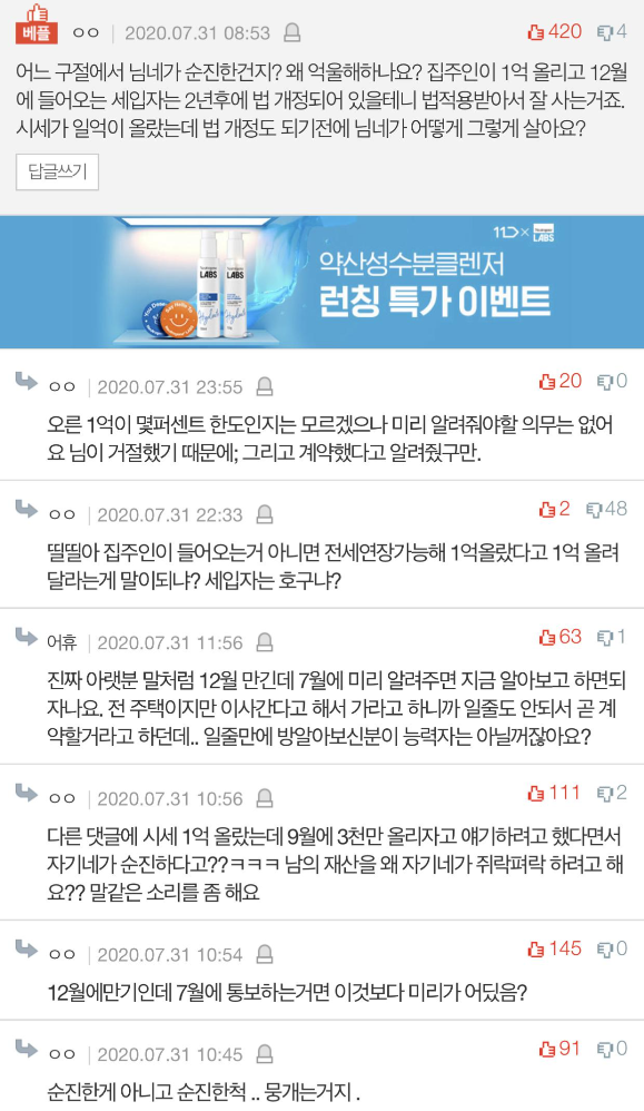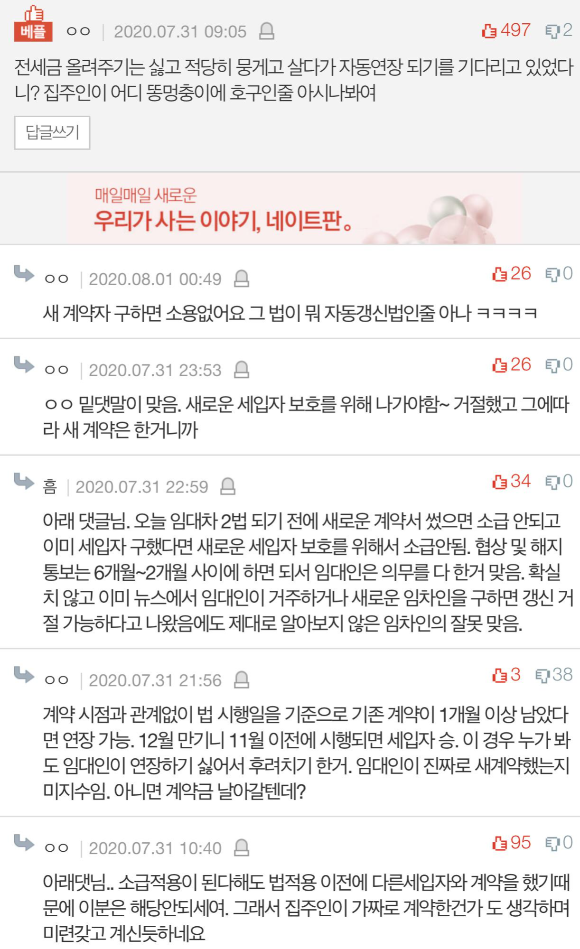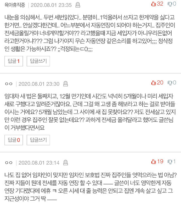 집주인은 그걸 나간다는 의미도 받아들였다고 하더라고요. 그래서 새 세입자 구했다는 논리에요. 저랑 남편은 조금 불안하긴 했지만 그래도 법 통과되면 자동 연장되는 걸로 생각했는데 그 사이 이렇게 새 세입자 구해놓고 있을줄은 몰랐네요. 새 세입자 구해놓고 일부러 고생해 보라고 어제 밤에 얘기한 거 같아요. 계약은 벌써 2주 전에 했답니다...