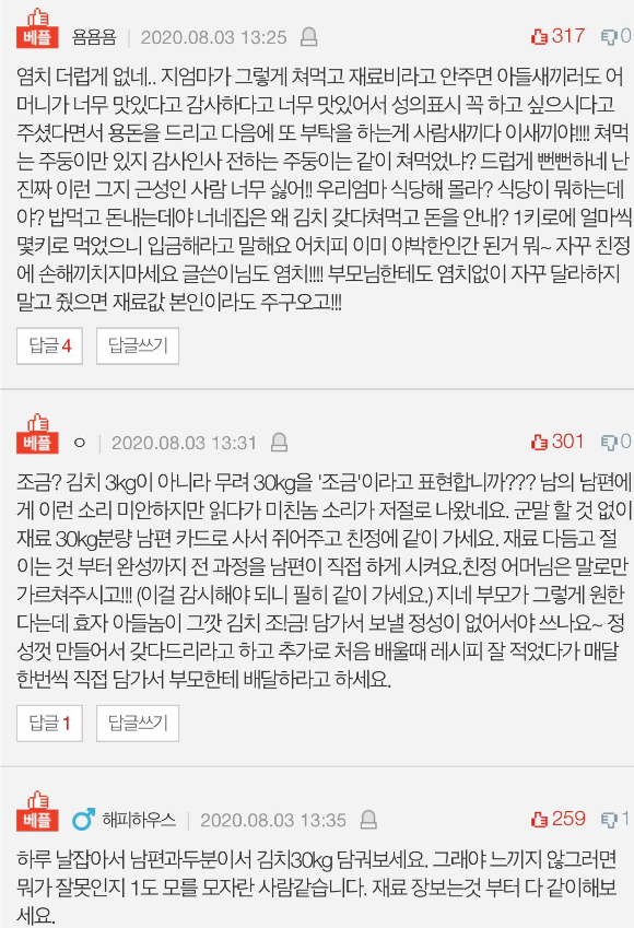 김장김치 한통을 줬는데 한달도 안되서 다 드셨다며 한통 더 달라고 신랑 통해 자꾸 푸쉬하시고 제가 말을 돌리고 돌렸지만 계속 그러니 결국 또 한통 드리고