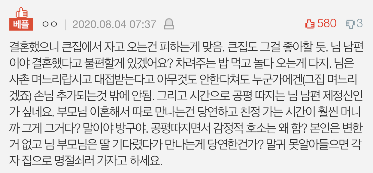 예랑 : 아니 그게 아니라 우리 엄마 집에 혼자계시잖아.. 9/30일에 큰집가서 하루자고 10/1 일 추석 당일에 점심먹고 우리엄마집에 가면 어때? 시간도 30분 정도 걸리고 가까우니까 가서 엄마랑 저녁같이 먹고 하루자고 10/2일 점심에 같이 친정내려가자. 이렇게 말하더라구요..