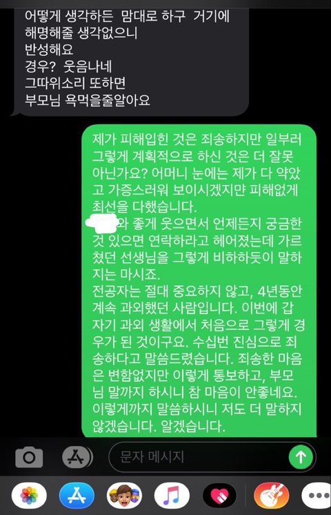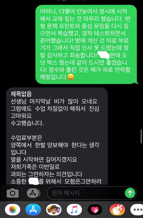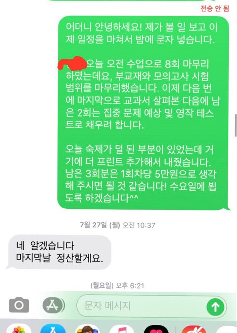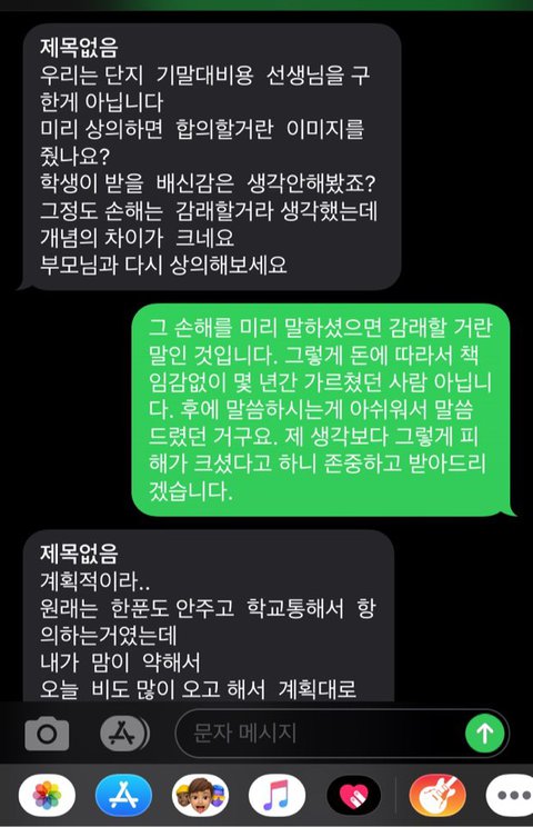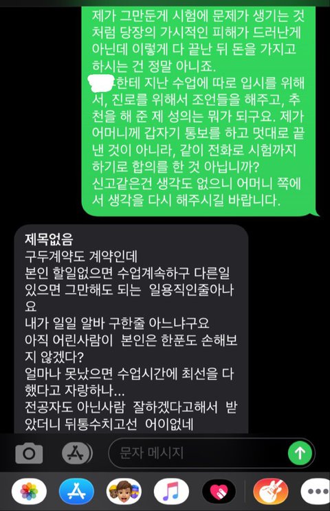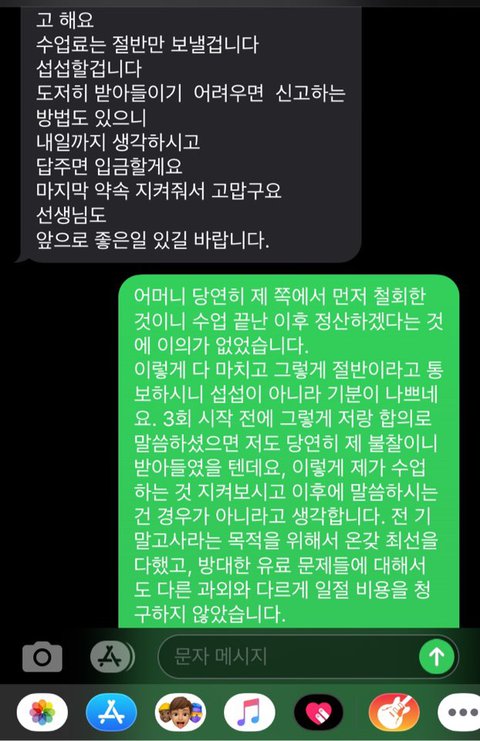 사진이 10장까지라서 다음 글에 올리겠습니다. 일단, 과외비는 대부분 선불이지만, 제가 중도에 끊는 것이니 감수해야 하는 것으로 생각하고, 받아들였습니다. 마지막 수업을 마치고 저렇게 3일간 진행되어 온 것인데, 정말 참으면서 부모님과 상의하면서 예의바르게 답했습니다. 사전에 아무 말 없이 갑자기 반만 준다고 통보하시니, 저 또한 어이가 없어서 처음에 받아들이지 못하다가 그래 그럴 수도 있겠다라는 너그러운 마음으로 이해했습니다. 그런데 계속 입금이 없고, 문자도 답변이 없더라고요.