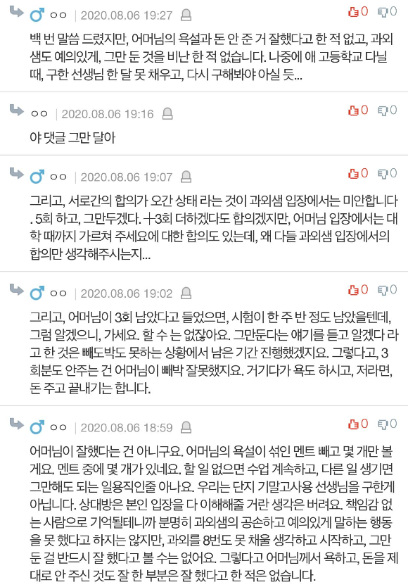 안녕하세요. 먼저 저는 해당 과외를 7월 초에 시작했고, 인턴이 다 떨어진 후라 쭉 할 수 있을 것 같다고 말하면서 시작했습니다. 제 불찰이었죠. 그런데, 3회 정도 수업하고, 떨어진 회사에서 전화가 다시 왔습니다. 고민을 많이 했지만, 이러한 코로나 불경기에 회사를 선택하는 것이 맞다고 여겨서 어머니께 전화를 드렸습니다. 8회 기준으로 돈을 받고 있어서 8회를 마치고, 제 지인을 바로 연결해 드리겠다, 혹은 원하시면 기말고사까지 회사다니면서 열심히 해드리겠다고 했습니다. 정말 죄송하다고 사과도 수십 번 드리고, 어머니도 뭐라하시기는 했지만,