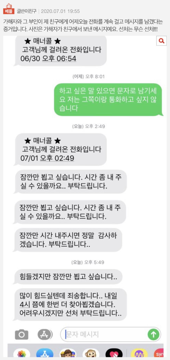 저에게 계속 전화를 걸며, '미안하다, 정말 사죄하고 싶다.'며