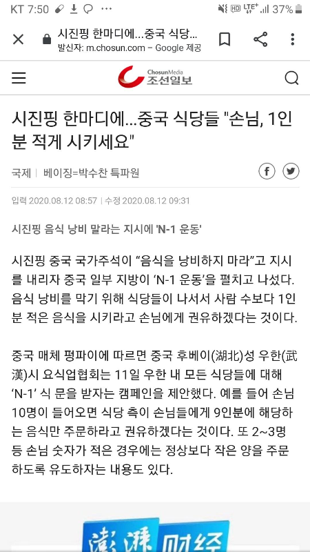 이미 중국은 식당에서 음식 주문 시 한명의 식사를 덜 주문하는 N-1 캠페인을 대대적으로 벌이고 있는 게 현실이지요.