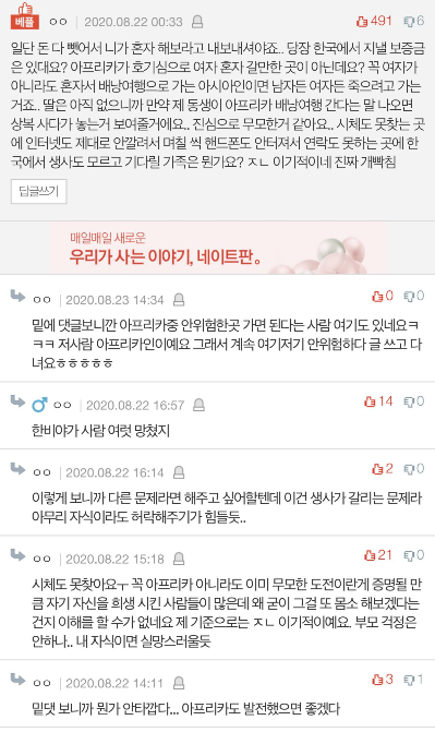 그 꿈을 이루려고 노력하는 모습 정말 존중하고 응원하지만 굳이 이시국에 그럴 필요도 없고, 특히 그게 아프리카 여행과 관련된 거라면 더더욱 싫습니다...