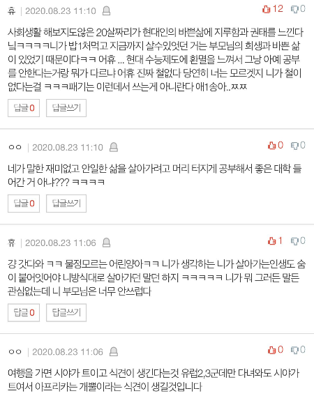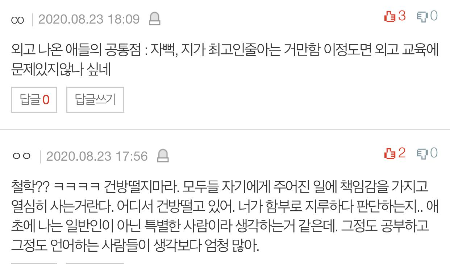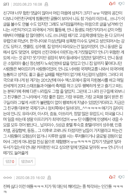 감히 스무 살짜리인 제가 뭘 알겠느냐고 하시겠지만 여기까지가 제 진심이 담긴 의견이었고, 소신껏 말씀드리는 것이니 비판의 댓글은 겸허히 받아들이겠지만 비하의 댓글은 달리지 않았으면 좋겠습니다 ㅜ.ㅜ