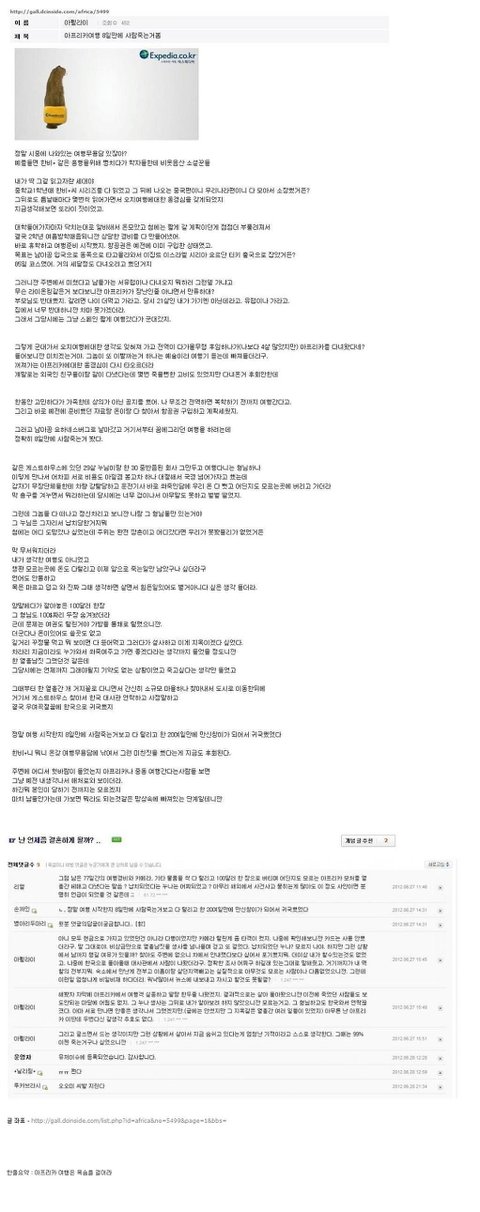 결국 그 친구하고 인터넷에서 같이 가기로 한 한명하고 두명이서 출발했을거야. 유저이슈에 등록된 글처럼 아프리카로..