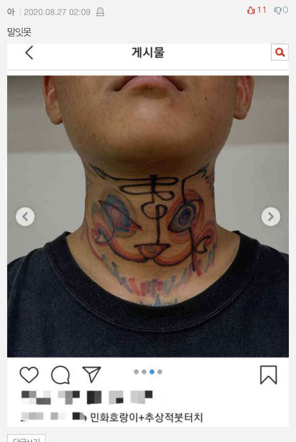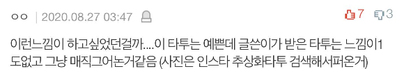 일주일전 천안에 한 타투샵에서 원래 새겨져 있던 타투가 마음에 들지 않아 커버업 진행을 위해 상담을 했고, 가족탄생화로 커버업을 하기로 하였으나도안이 썩 마음에 들지 않아 일주일동안 생각해 보겠다. 라고 하였습니다.