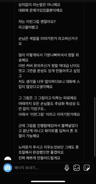 35만원에 대해 추가설명 드리자면, 원래 가족탄생화 도안을 35만원에 작업받기로 하였기 때문입니다. 그래서 그 부분에 대한 보상만 해줄 수 있다고 한 상황입니다. 지금 인스타그램 계정 차단은 물론이고 보내셨던 디엠도 삭제된 상황입니다. 저와의 대화는 더 이상 필요 없다고 생각하시는 것 같습니다....