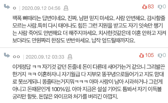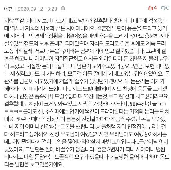 저희부부 매달 200씩 각자 모아서 생활비+부부적금 넣고 나머지는 개인이 적금넣든 쓰든 마음대로라 저는 부모님 용돈 안드리니 혼자 모아서 아빠 드리는건데 제가 모은걸 제맘대로 돈 많은 장인어른 드린다고 화를낸다니 진짜 어이가 없어서 너는 매달 부모님 용돈 드리고 나는 모아서 드리는거다 왜 니가 참견이냐라고 하니까 요즘 코로나 때문에 힘들어서 우리 부모님들도 용돈 더 필요하시다라면서 말도안되는 어깃장을 부리네요.