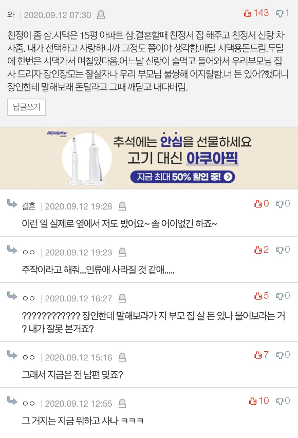 남편한테 보여줬더니 자기도 말해놓고 후회했다며 갑자기 사과를 하더라구요. 근데 이상하게 사과받고 나니까 더 기분이 안좋은 느낌이네요.