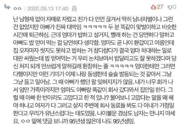 돌아가는 길에 전남친이 우리 부모님이 너 되게 마음에 드셔하는 것 같다고 설거지하는 거 돕고 개념녀라고 자기 엄마 도와 설거지하는 모습이 너무 예뻤다고 막 칭찬함.