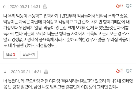 하지만 분명히 동생들 때문에 가졌을 책임감이나 포기해야 할 것들이 많았다는건 저도 알고 있고, 부모님도 이 점을 늘 미안하게 생각하셔서 큰오빠가 독립할 당시 일정부분의 재산과 집을 더 물려주셨습니다.