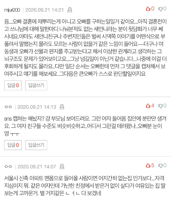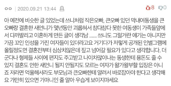 근데 막내오빠를 통해 예비 새언니가 저 때문에 오빠랑 결혼을 망설인다는 이야기를 들었습니다.