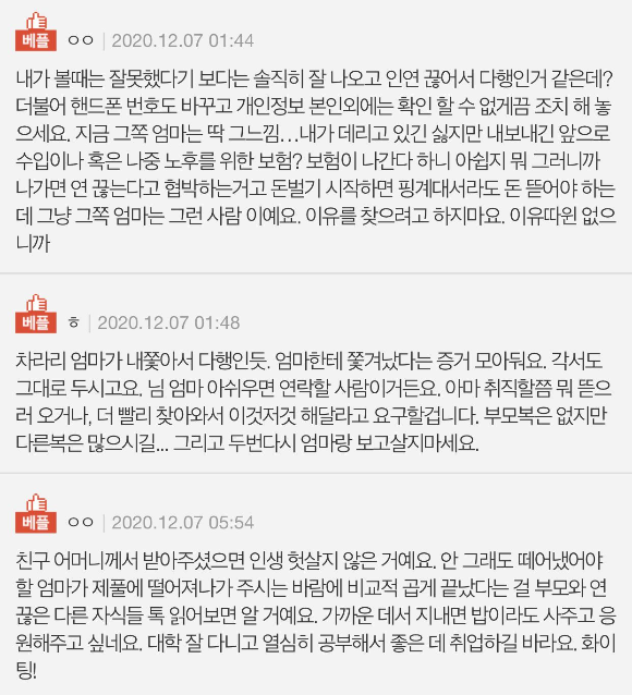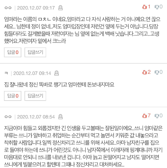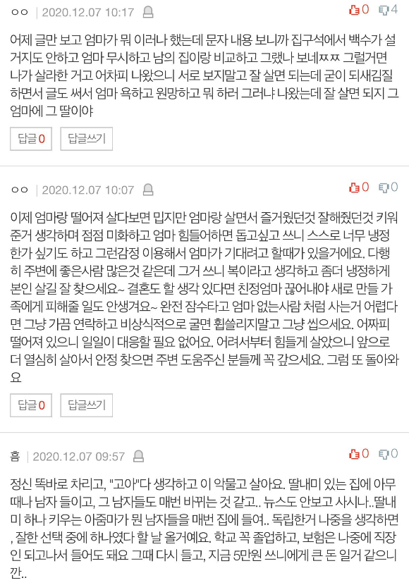 참고하시길 바라며 이런 식으로 글을 올려 엄마 욕먹이는 게 그 엄마에 그 딸이라는 말씀은 참고하도록 하겠습니다.