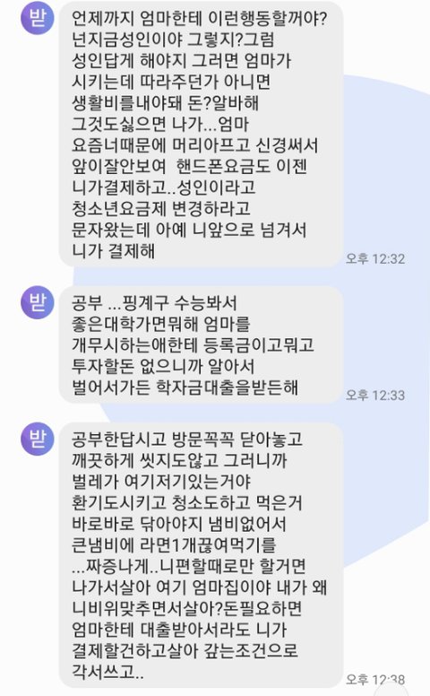 그리고 엄마한테 집에 바퀴벌레가 나온다며 말을 걸었더니 그때 하는 말이 "네가 방을 더럽게 쓰니까 바퀴벌레가 나오는 거 아니냐."며 문자를 보냈고 또 싸웠습니다.